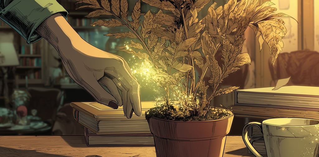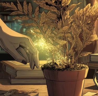 Her magic—the earthy, unruly core of it, the part she spent most of her energy suppressing—didn't ask permission. It never did. A slow warmth moved from her fingertips, invisible, automatic as a flinch. In the space only she could see, a shimmer of brown-gold light, soil-colored, moved into the plant. A whisper. An accident.