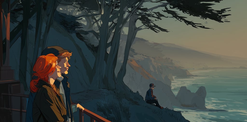 Their attention was fixed on a young couple laughing against the railing overlooking the surf. The young man, tall and lanky with an artist's thoughtful expression, was teasing the woman beside him. She possessed a smile that seemed to radiate joy, her red-gold hair catching the last rays of light like a halo.