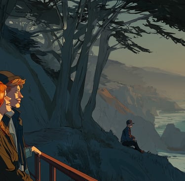 "Kwan," Hale murmured into his comm. "Subject found. West Cliff, near the lighthouse overlook. Target appears to be the female, red-gold hair, with a taller male companion. Our suspect is observing from the sea wall, south of their position. Dark hair, baseball cap, currently sketching."