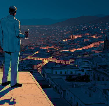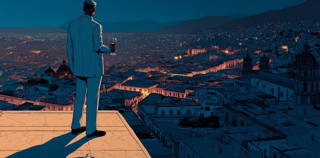 Meanwhile, across the city in its most exclusive quarter, Lucian de Vries - disguised as the impeccably tailored Señor Alvaro Herrera - studied Arthur Finch across a linen-draped table. Oaxaca's most exclusive rooftop restaurant. City lights pulsed below in a glittering web. The air carried damiana and expensive cigars.