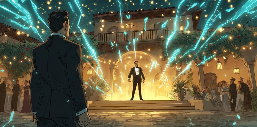 Hale's mental senses were on high alert. The air was thick with sickeningly sweet, artificial joy. De Vries's projection, a shimmering mental blanket designed to soothe, disarm, make everyone blissfully content. Beneath it, individual threads of control connected de Vries to his targets: Tina Schweppes, radiant yet hollow-eyed, holding court near a fountain; Baron von Kessler, nodding serenely over his champagne, gaze distant; Arthur Finch, standing beside de Vries near a small platform, nervous yet filled with prophet-like passion.