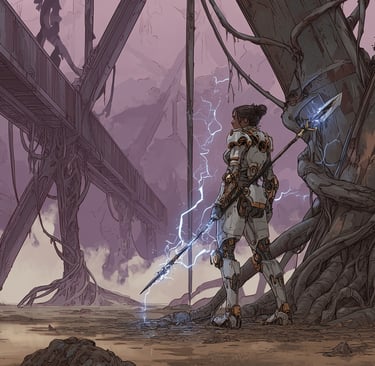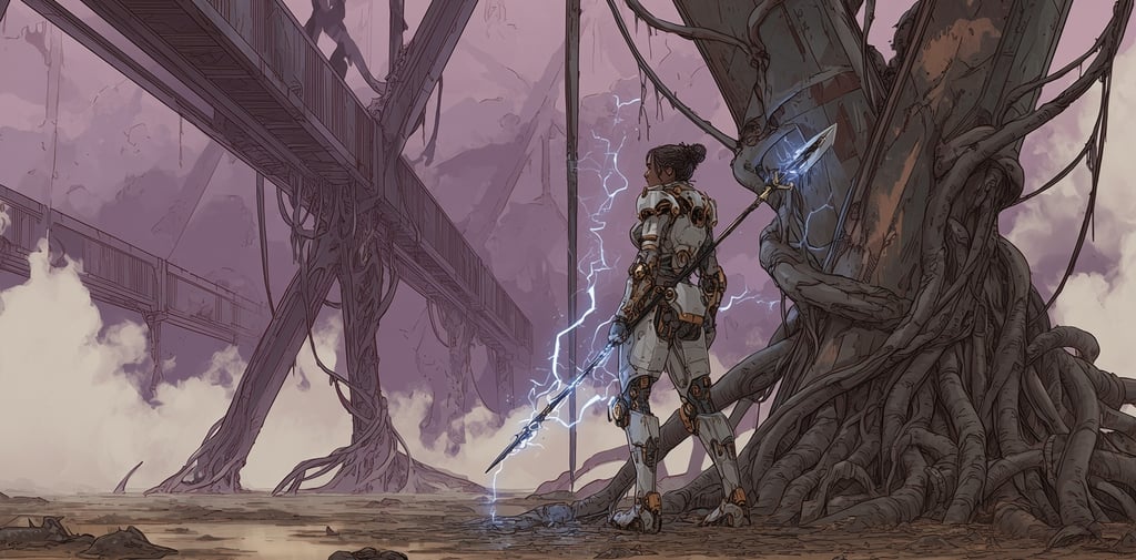 She walked. Her boots sank an inch into the ferrocrete path—the humidity had softened it to something close to mud. Her armor used to shine. Silver and gold, the Stormbringer colors. Now it was dull, scuffed, the flat matte of occupation forces. The right knee motor hitched with every step. Three cycles she'd meant to get it fixed. Three cycles.