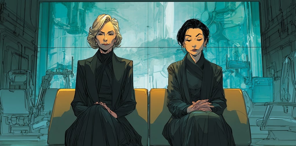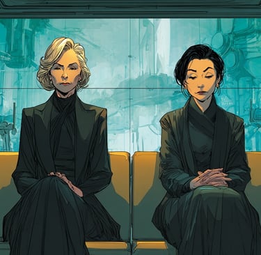 The lounge was designed for contemplation: low light, soft materials, a large pane of smart-glass that looked in on the recovery suite where Jamila lay surrounded by machines that blinked steadily in the silence. A beautifully decorated tomb. Imran sat beside his mother's bed, pale as paper, barely moving. He'd returned from Bombay like a man already half-haunted. Margaret and Sook-ja had kept watch here for two days - not because anyone had asked them to, but because the world had streamlined away every other ritual of comfort, and this was all that remained.